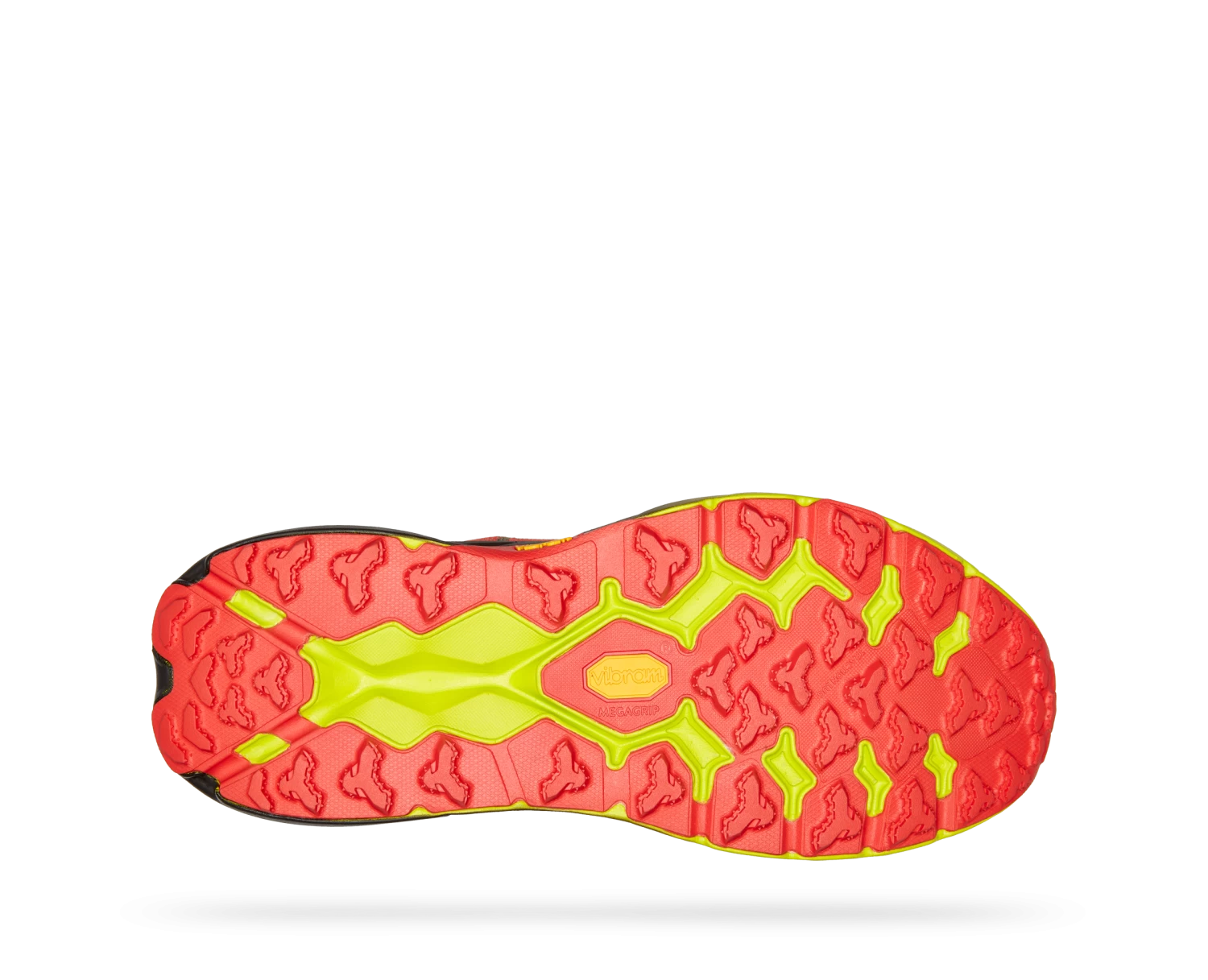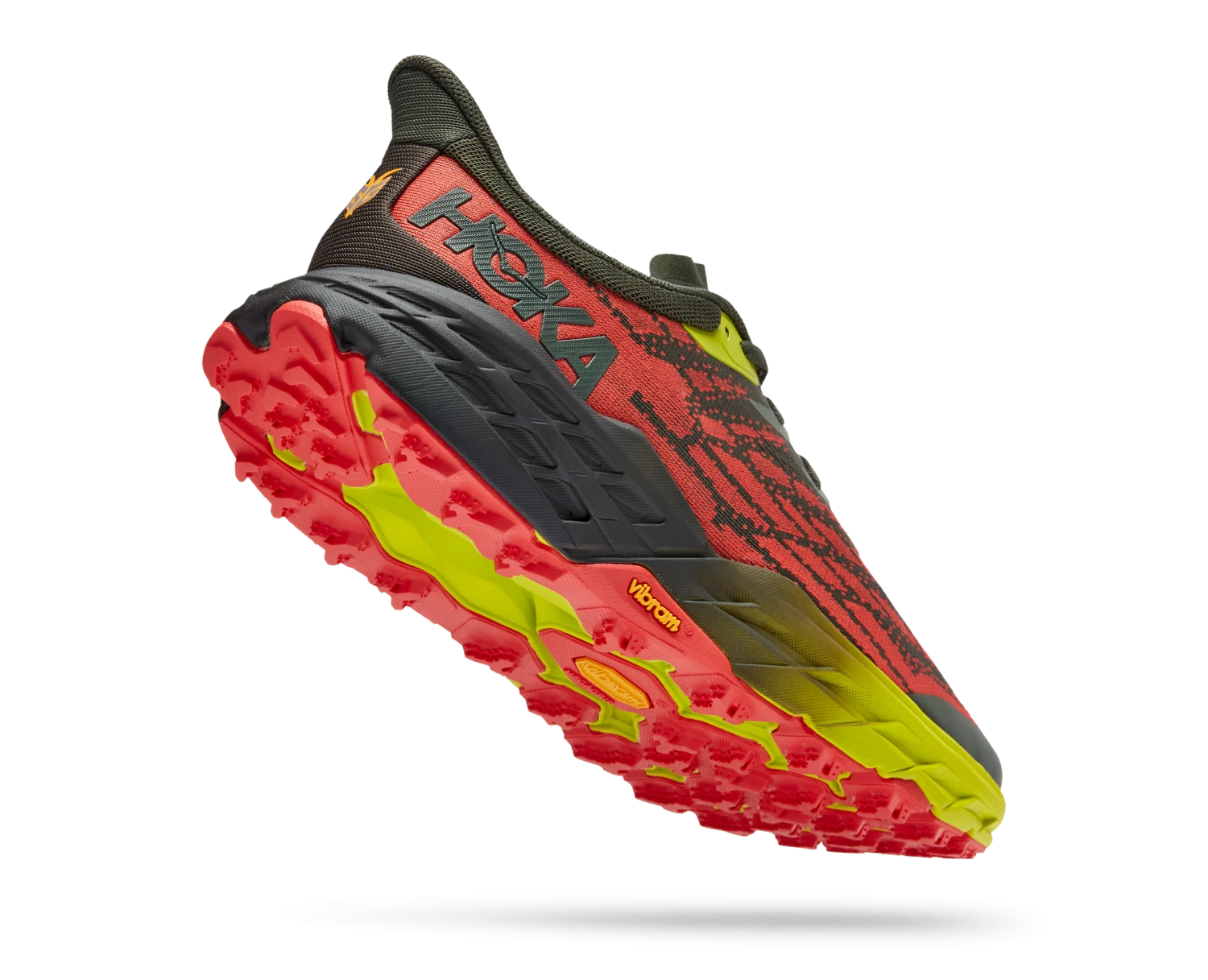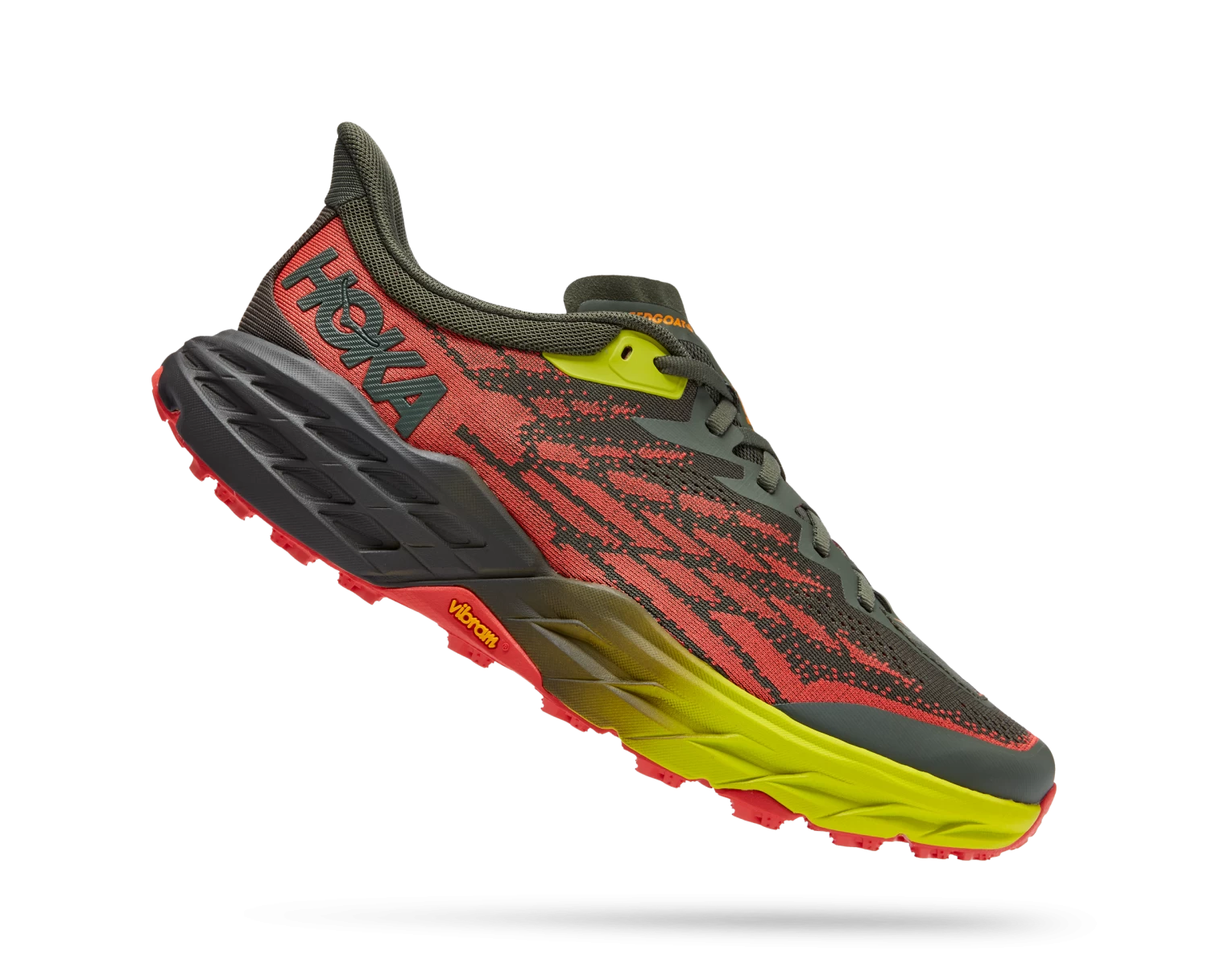 A workhorse designed for technical trails, the Speedgoat returns with less weight and more traction than ever before. A new shoe from outsole to laces, this trail beast is updated with Vibram Megagrip with Traction Lug for enhanced grip on loose soil. Retaining the same stack height and rocker profile, the Speedgoat 5 employs a lighter midsole compound and heartier, double layer jaquard mesh to inspire confidence on any terrain.