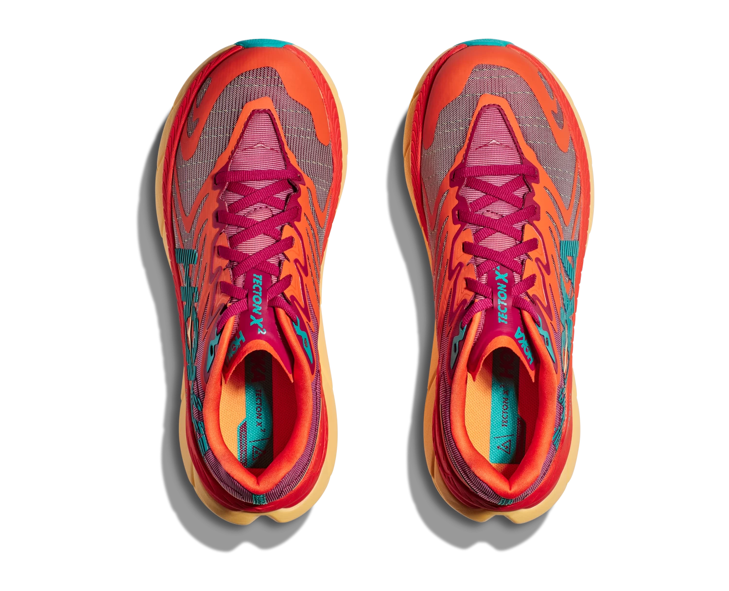 Reengineered to maximize weight savings, the Tecton X 2 has been refined with a brand new Matryx® upper. Light, breathable, and inherently hydrophobic, our high-contrast Matryx® upper enlists a lay-flat gusseted tongue to help mitigate trail debris. A propulsive trail runner designed to inspire confidence on varied terrain, the Tecton X 2 is propelled by the same parallel carbon fiber plates that made its predecessor a fast favorite among trail running enthusiasts.