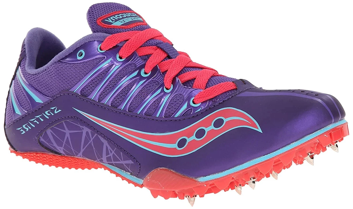 The lightweight Saucony Spitfire spike is a value shoe designed to put you over the finish line well ahead of the competition. Equipped with a supportive, welded quarter cage and eyerow, this women’s sprint spike athletic shoe features a lightweight mesh and synthetic upper with EVA for underfoot cushioning and a 7-pin PebaxÂź Ÿ-spike plate.